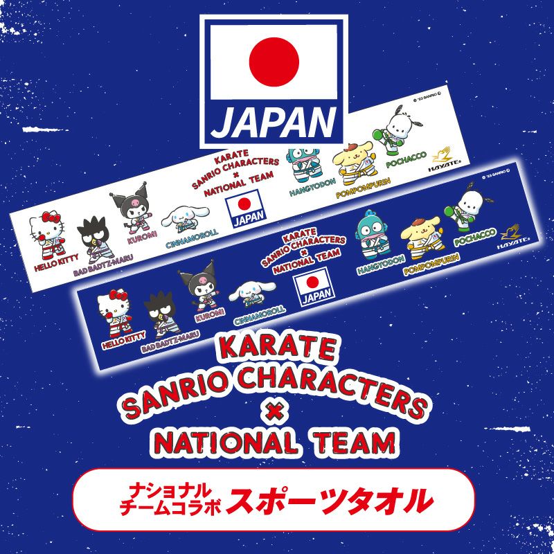 KARATEWEEKにて好評につき、HAYATEオンラインショップでも販売開始いたします! 多くのご注文が予想されます為に発送までにお時間を頂戴する可能性がございます。予めご了承くださいませ。 7キャラクターのサンリオキャラクターズが勢揃い!タオルのカラーはホワイトとジャパンブルーからお選びいただけます。
