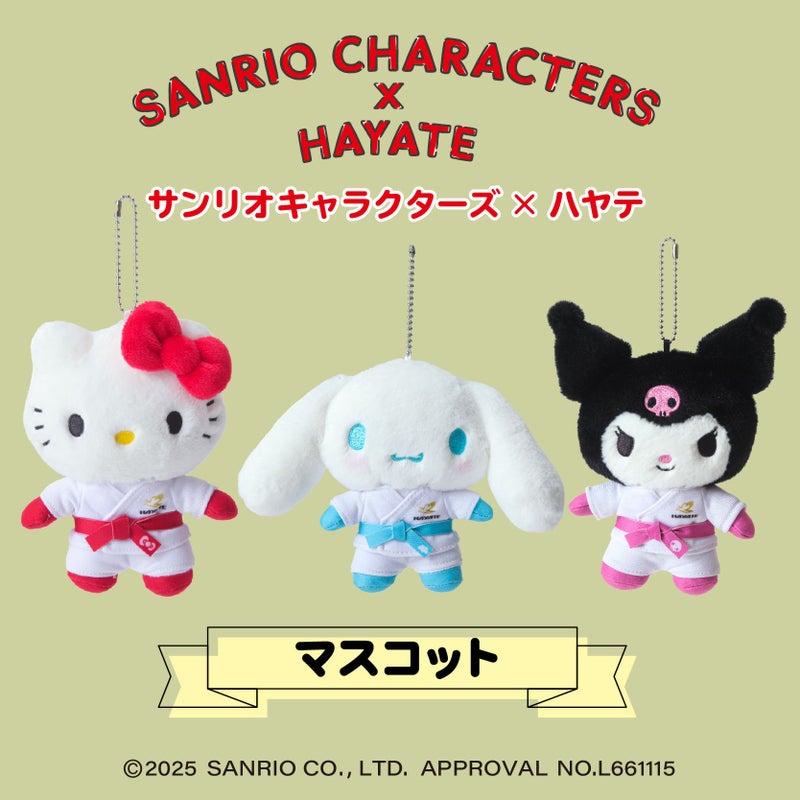 人気キャラクターのハローキティ、シナモロール、クロミが、空手スタイルのぬいぐるみになりました。それぞれがHAYATEロゴ入りの空手着をまとい、帯の色にも個性が光るデザインに仕上がっています。