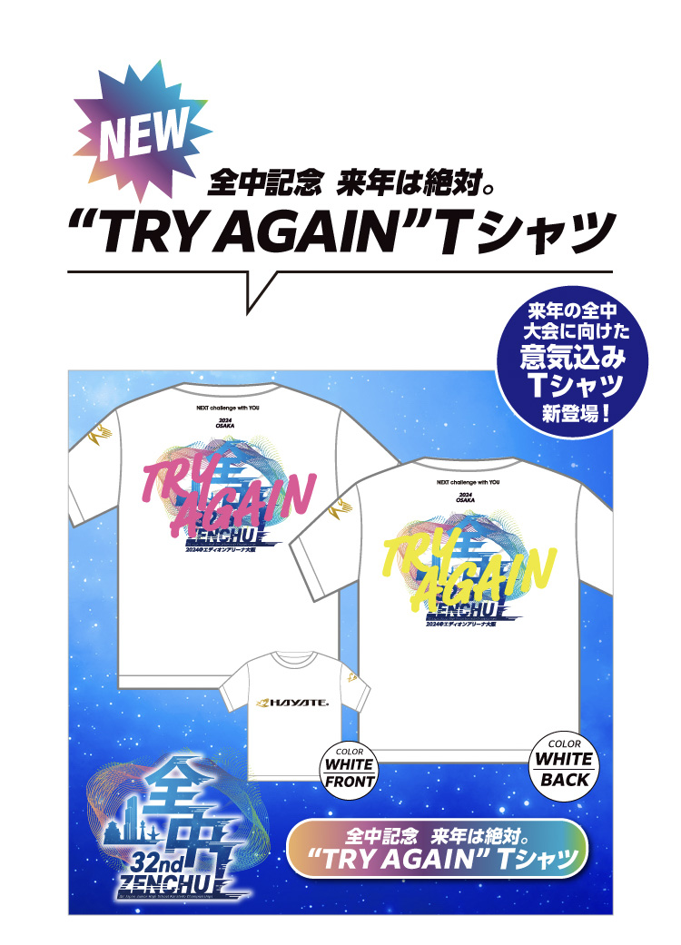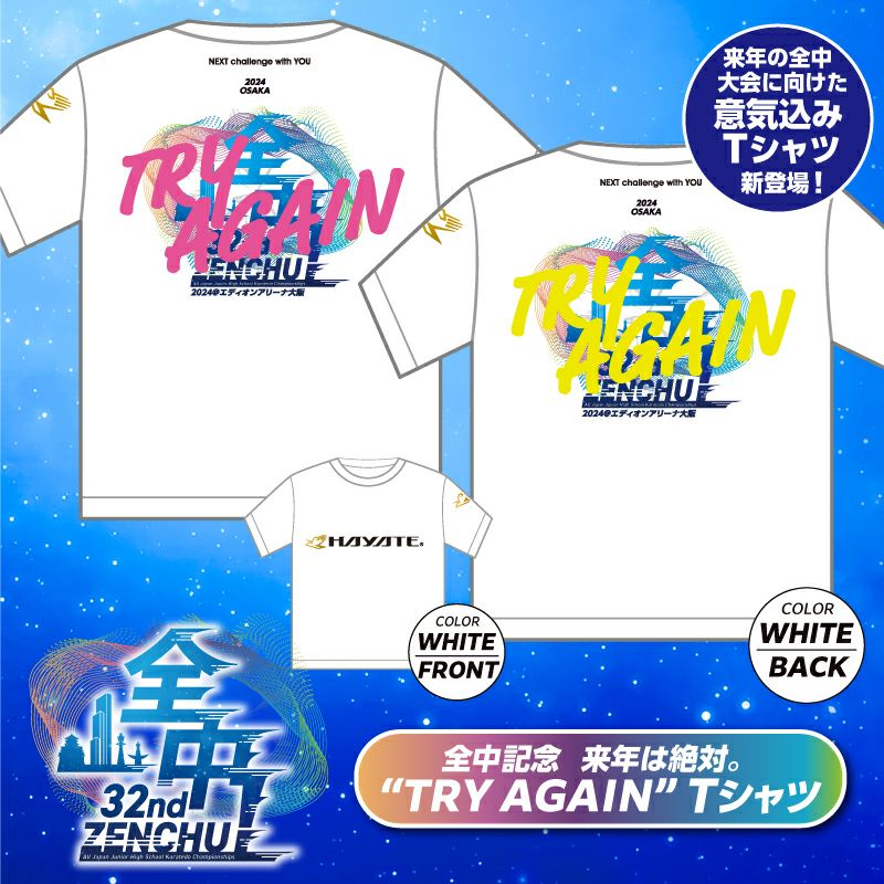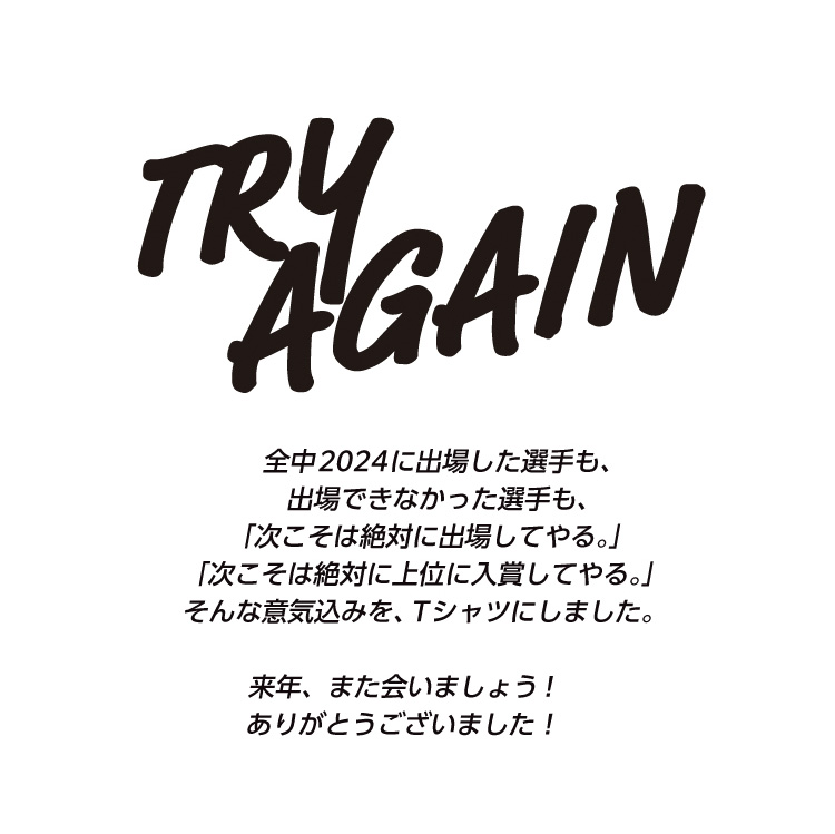他の画像を見る 来年の全中に向けた熱い想いを [全中32nd]来年は絶対。”TRY AGAIN”Tシャツ 当店特別価格 ¥ 3,800 税込 販売期間 2024/08/22 18:00 〜 詳細を見る お気に入りに登録する