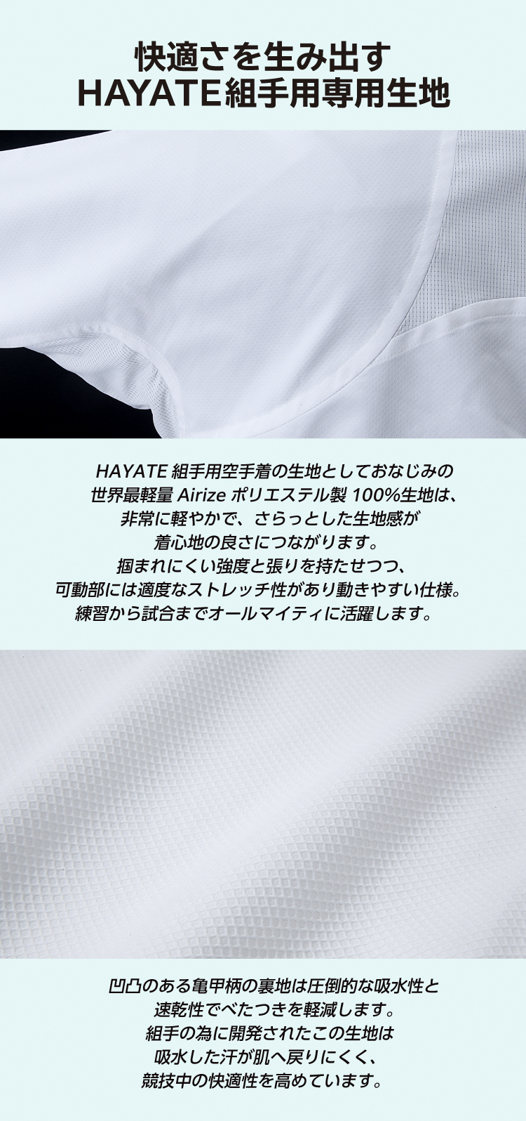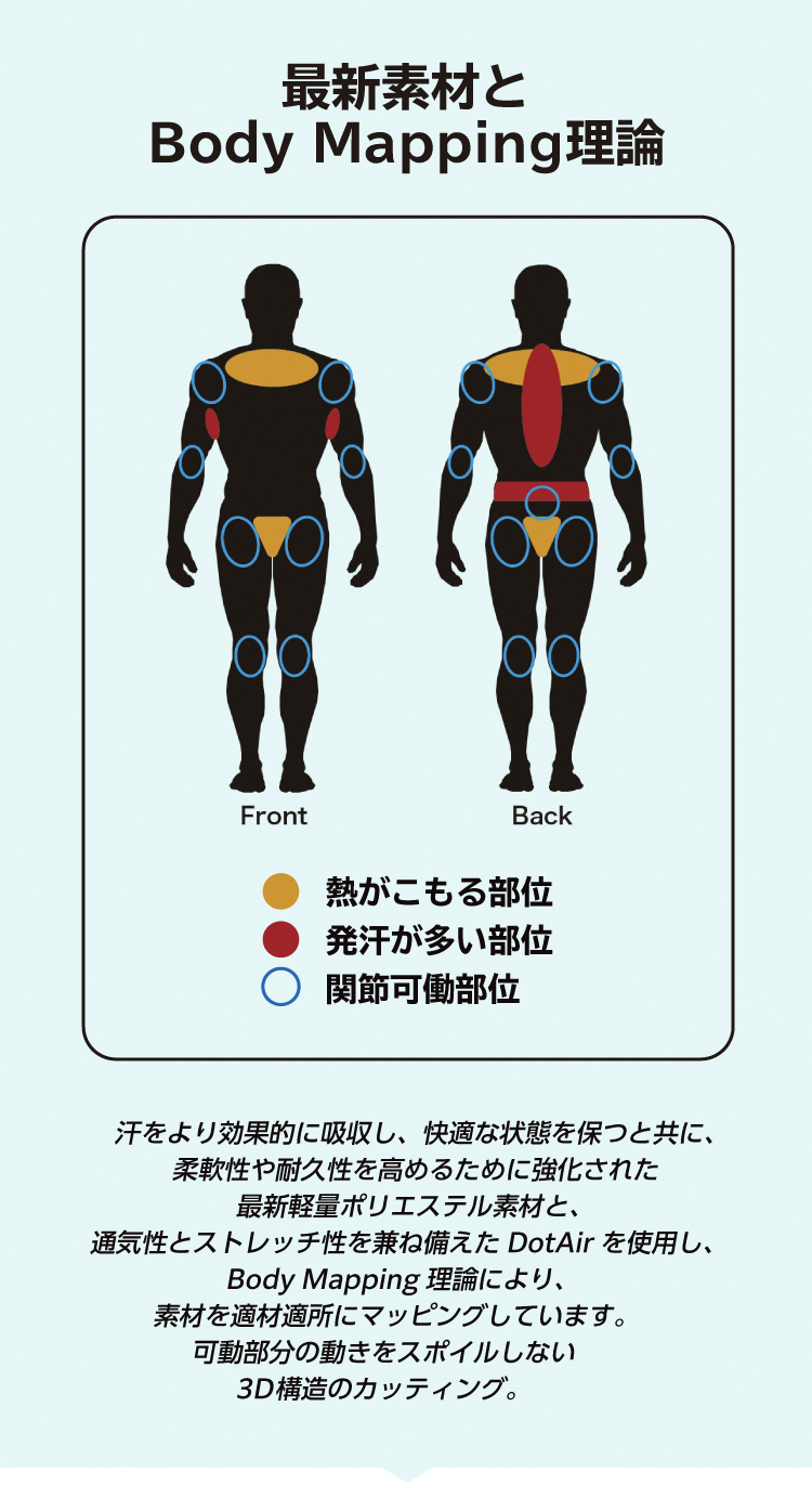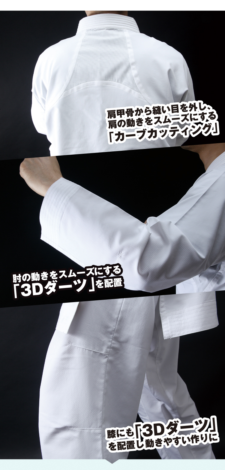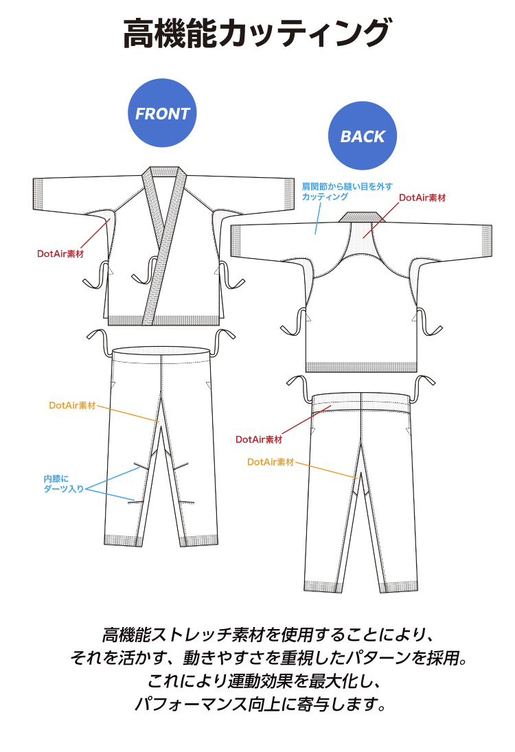 最新素材と「Body Mapping」理論を組み合わせ、素材を適材適所にマッピングし競技時の運動効果を最大限に高めたハイテクノロジー組手道着。