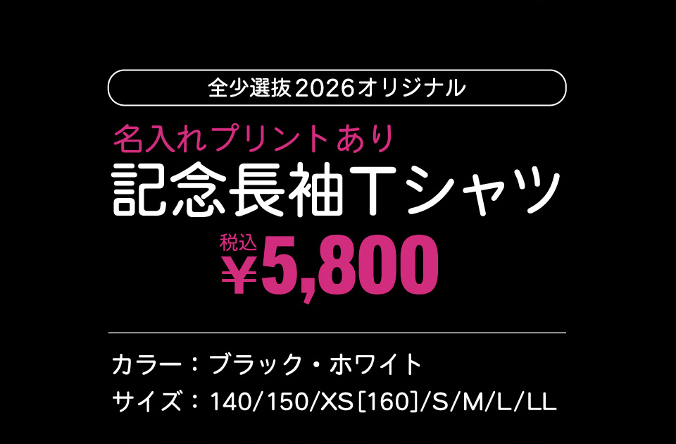 他の画像を見る 2025.12/19~2026.1/7期間限定販売 [全少選抜2026]大会記念オリジナル長袖Tシャツ【名入れあり】 当店特別価格 ¥ 5,800 税込 販売期間 2025/12/19 20:00 〜 2026/01/07 23:59 詳細を見る お気に入りに登録する